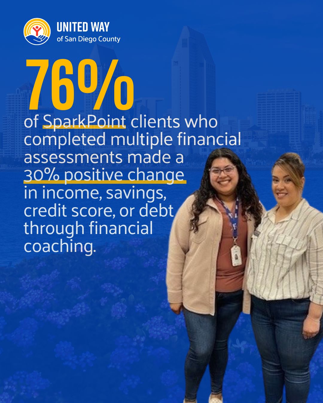 In fact, 76% of SparkPoint clients who completed multiple financial assessments made a 30% positive change in income, savings, credit score, or debt through financial coaching.